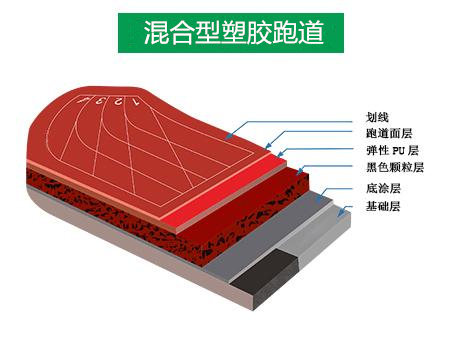 混合型聚氨酯跑道以化學(xué)原料在工廠制備甲乙兩組分, 現(xiàn)場使用時,將兩組分混合,同時加入填料等,經(jīng)過鋪設(shè)、噴涂顆料等一系列工序而成。具有彈性好、防滑、耐磨等優(yōu)點,且面層不容易脫粒。廣泛使用于國際、國內(nèi)大中型田徑場。